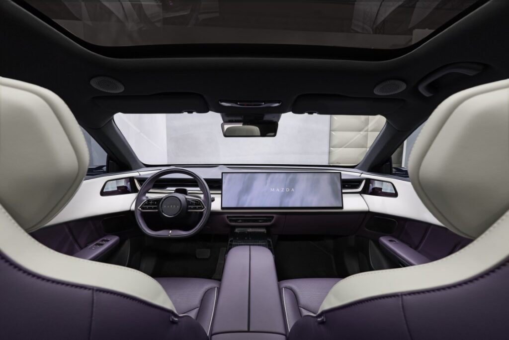 Der Mazda CX‑6e präsentiert eine zeitgemäße Interpretation der japanischen Formensprache. Die Front wird vom beleuchteten Signature Wing geprägt, während schlanke digitale Außenspiegel und Luftkanäle in den D‑Säulen die Aerodynamik verbessern. Wählbar sind sieben Außenfarben, darunter die neue Nuance Nightfall Violet, die je nach Lichteinfall unterschiedliche Tiefen und Reflexe erzeugt. Das Interieur folgt der japanischen „ma“‑Philosophie und setzt auf klare Linien, hochwertige Materialien und viel Raumgefühl. Ein Panorama‑Glasdach gehört zur Serienausstattung aller Varianten, so Mazda per Medieninformation.