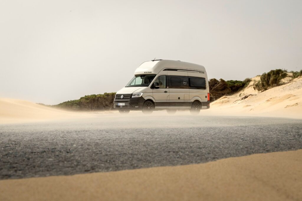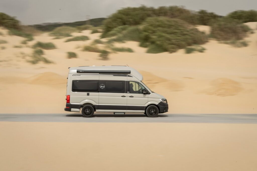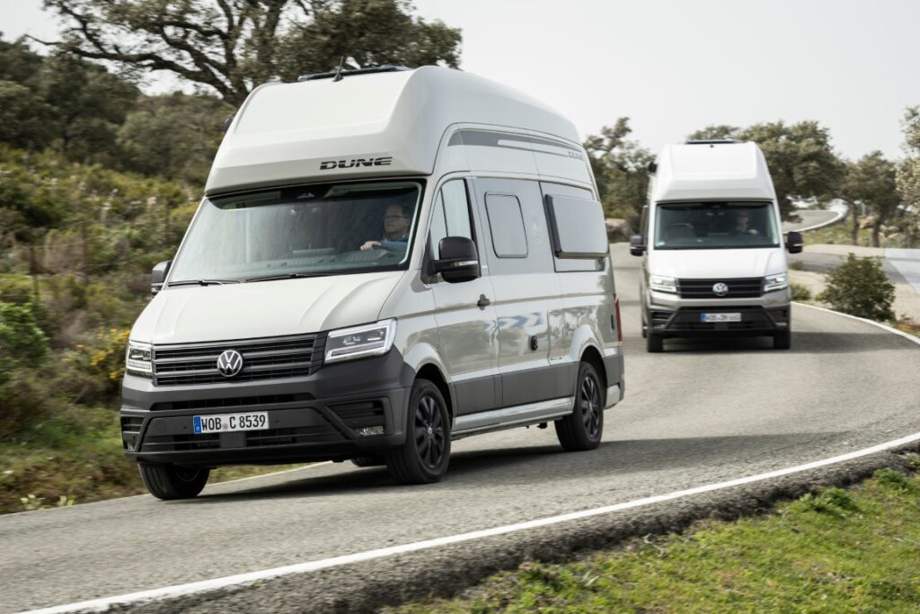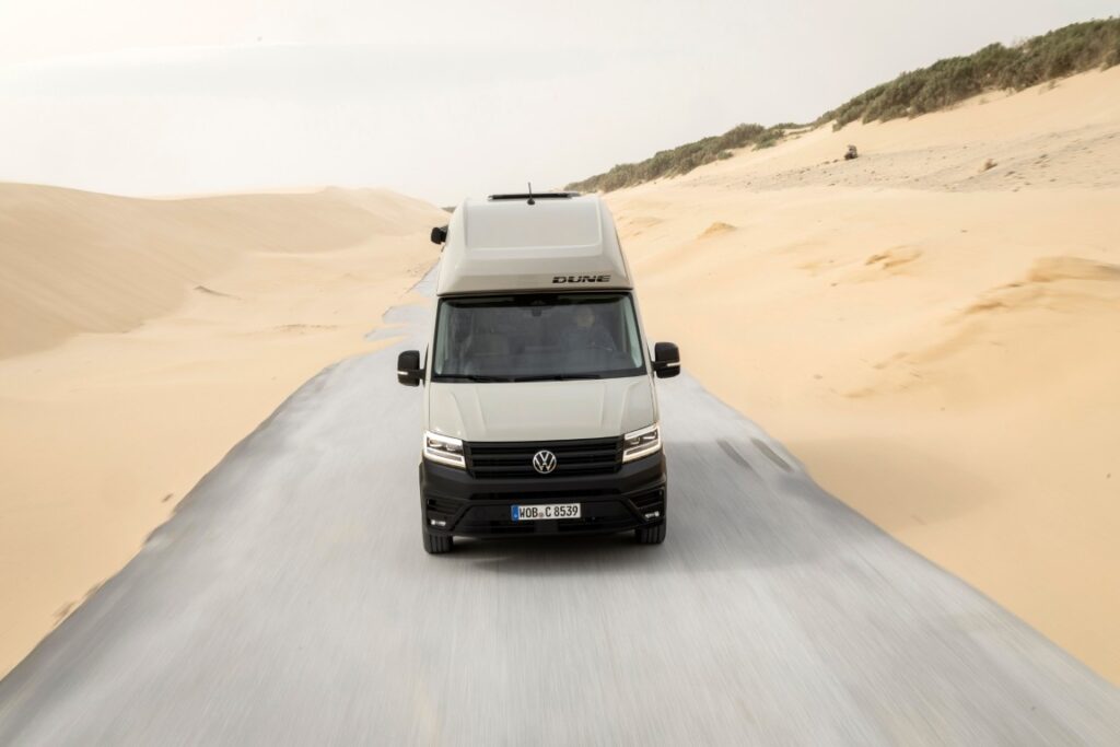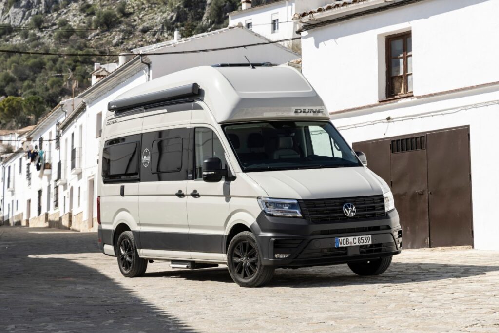 Mit dem Grand California Dune erweitert Volkswagen Nutzfahrzeuge die Baureihe um ein Sondermodell. Kennzeichnend sind die Lackierung in „Ascotgrau“, schwarze Designelemente sowie robuste Kunststoffbeplankungen. Das Modell verfügt serienmäßig über LED-Hauptscheinwerfer, Rückfahrkamera, elektrisch anklappbare Außenspiegel und die Klimaautomatik „Air Care Climatronic“. Ein erweitertes Assistenzpaket ist ebenfalls enthalten. Der Dune ist in zwei Längen verfügbar und kann optional mit dem Allradantrieb 4MOTION ausgestattet werden.