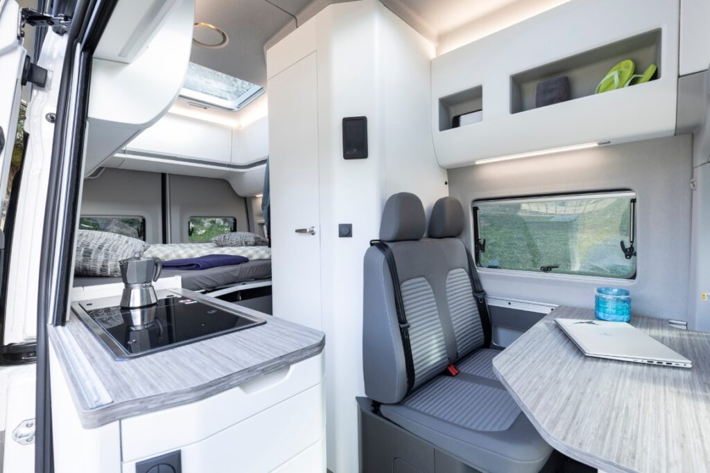 Im Mittelpunkt der Aktualisierung steht das neu gestaltete Interieur. Tischplatte, Arbeitsflächen und Bodenbelag sind nun im Dekor „Atami Bambus“ ausgeführt, das den Wohnbereich optisch aufwertet. Ergänzend wurden Bedienelemente wie Griffe, Schalter und Steckdosen in Schwarz ausgeführt. Neue Gepäcknetze in den Oberschränken vergrößern das Stauraumangebot, während der Esstisch künftig nicht nur im Innenraum genutzt, sondern auch außen am Küchenblock befestigt werden kann. Optional erhältlich ist zudem ein neues Thermomatten- und Verdunkelungsset.