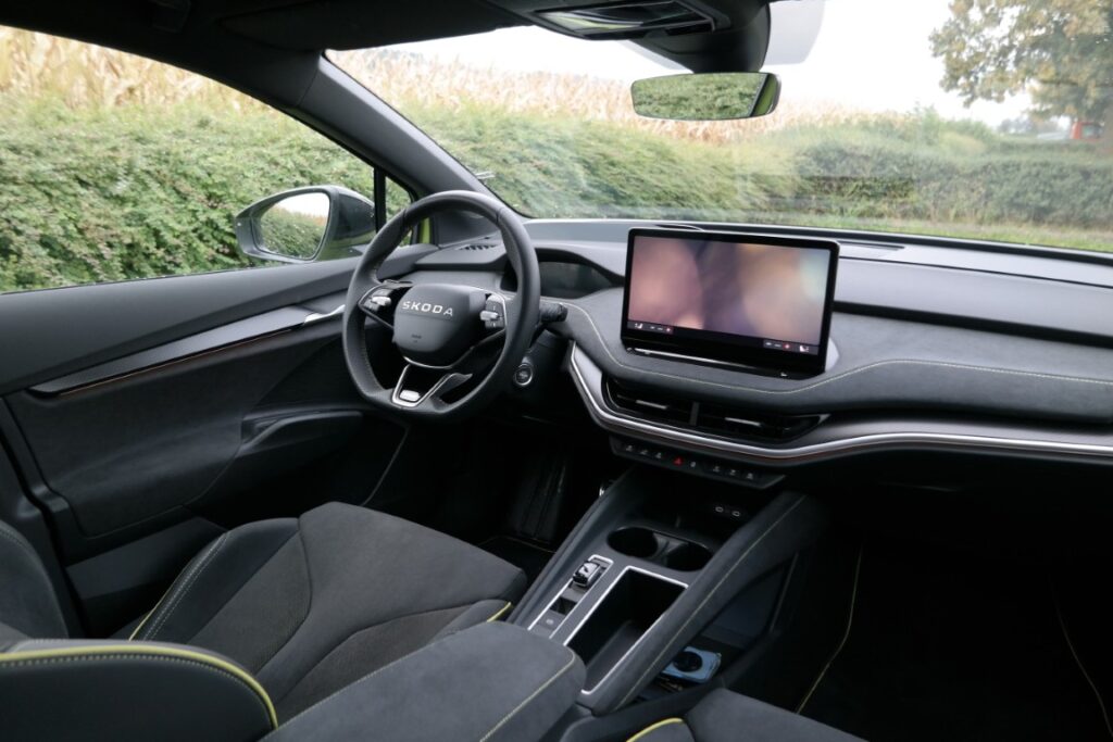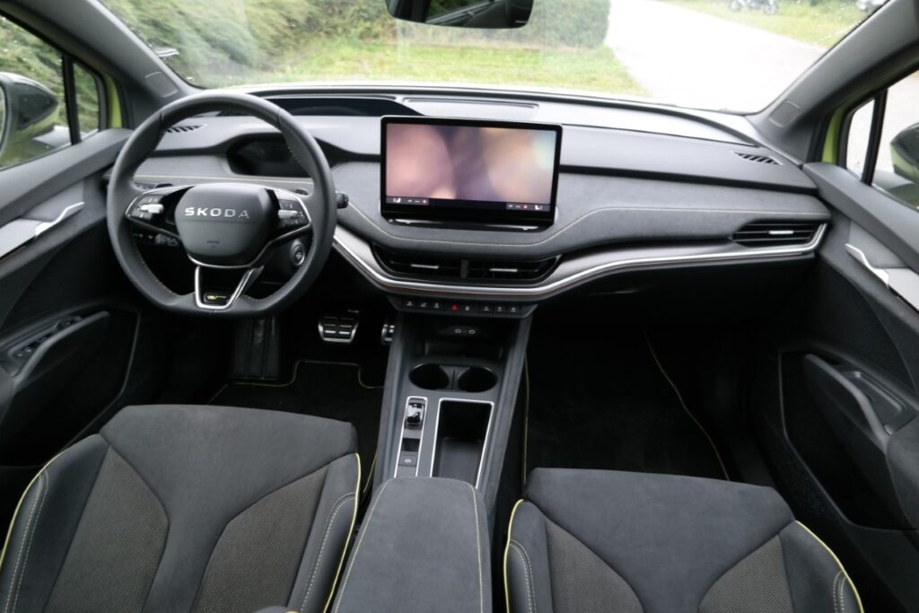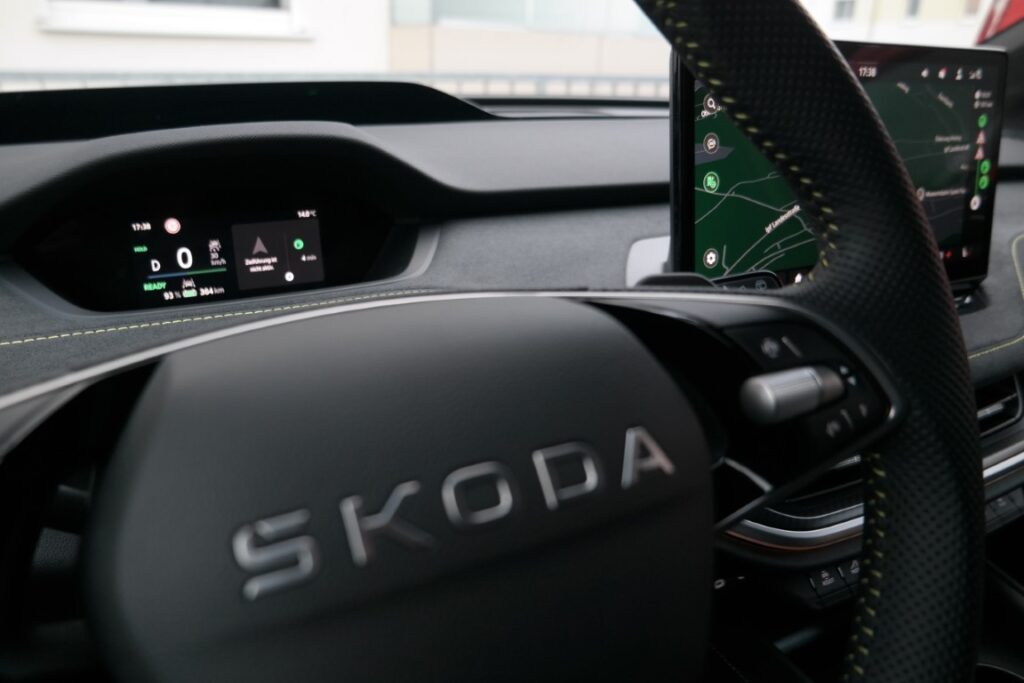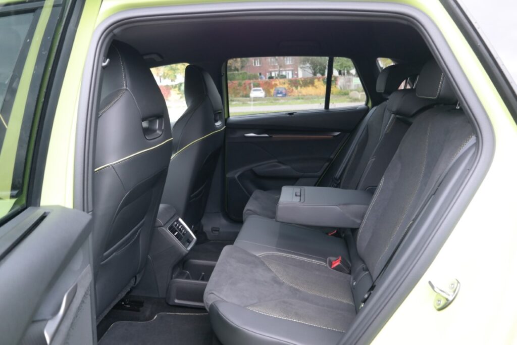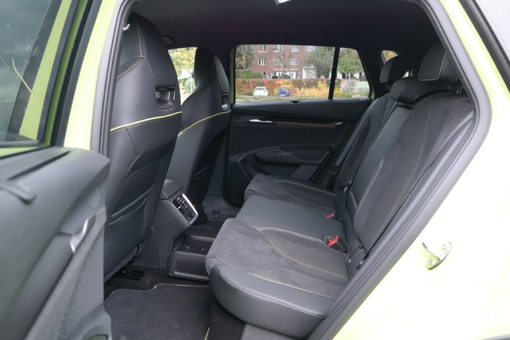 Im Innenraum punktet der Elroq mit großzügigem Platzangebot. Vor allem im Fond bietet er jede Menge Raum, was besonders größeren Passagieren zugutekommt. Die Rückbank ist bequem, die Polsterung weich und die Sitzposition angenehm hoch. Vorn sorgen RS-Sportsitze mit integrierten Kopfstützen für guten Seitenhalt. Negativ: Die Sitzfläche lässt sich nicht verlängern. Die grüne Ziernaht im Innenraum greift darüber hinaus die Außenfarbe auf und sorgt für ein stimmiges Gesamtbild. Alcantara und Carbonoptik unterstreichen den sportlichen Anspruch, ohne die Alltagstauglichkeit zu schmälern.