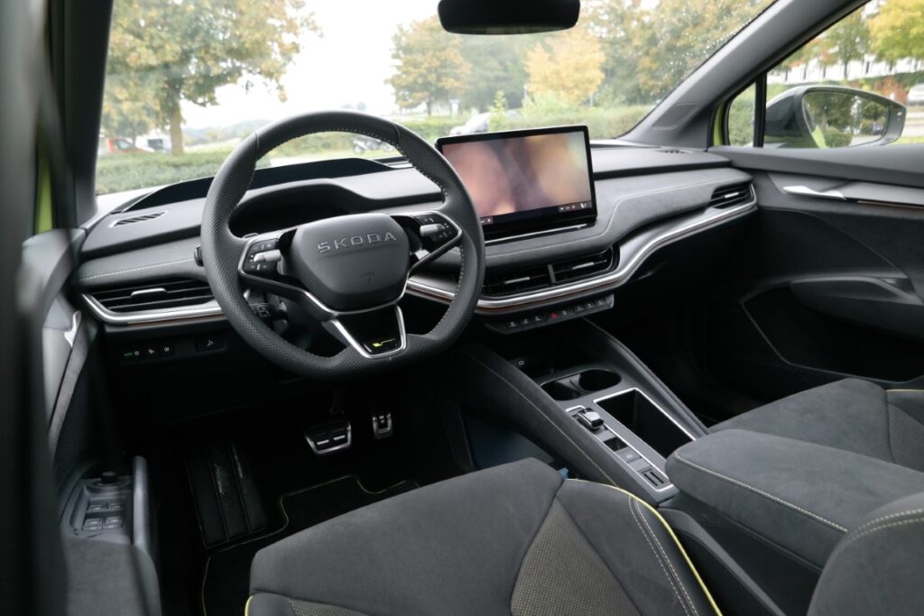 Optisch gibt sich der Elroq RS also typisch Skoda: sachlich, solide und eben funktional. Die RS-Variante setzt mit einer eigenständigen Frontschürze, sportlichen Emblemen und bis zu 21 Zoll großen Rädern dezente, aber wirkungsvolle Akzente. Am wirkungsvollsten ist dabei wohl die Außenfarbe Mamba-Grün: Die kostet zwar knapp tausend Euro extra, ist es aber auf jeden Fall wert.