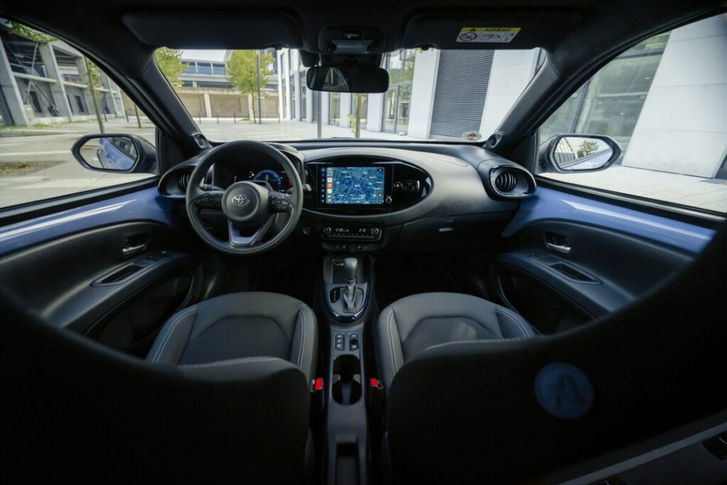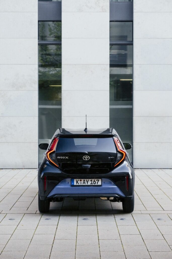 Um das Hybridsystem in den Aygo X integrieren zu können, ohne den kompakten Radstand von 2.430 Millimetern, das agile Handling und das Kofferraumvolumen von 231 Litern zu beeinträchtigen, waren innovative Konstruktionslösungen erforderlich. Vorne wurde der Überhang um 76 Millimeter verlängert, um den größeren 1,5-Liter-Hybridmotor unterzubringen. Die Proportionen des Aygo X wurden dabei aber beibehalten.