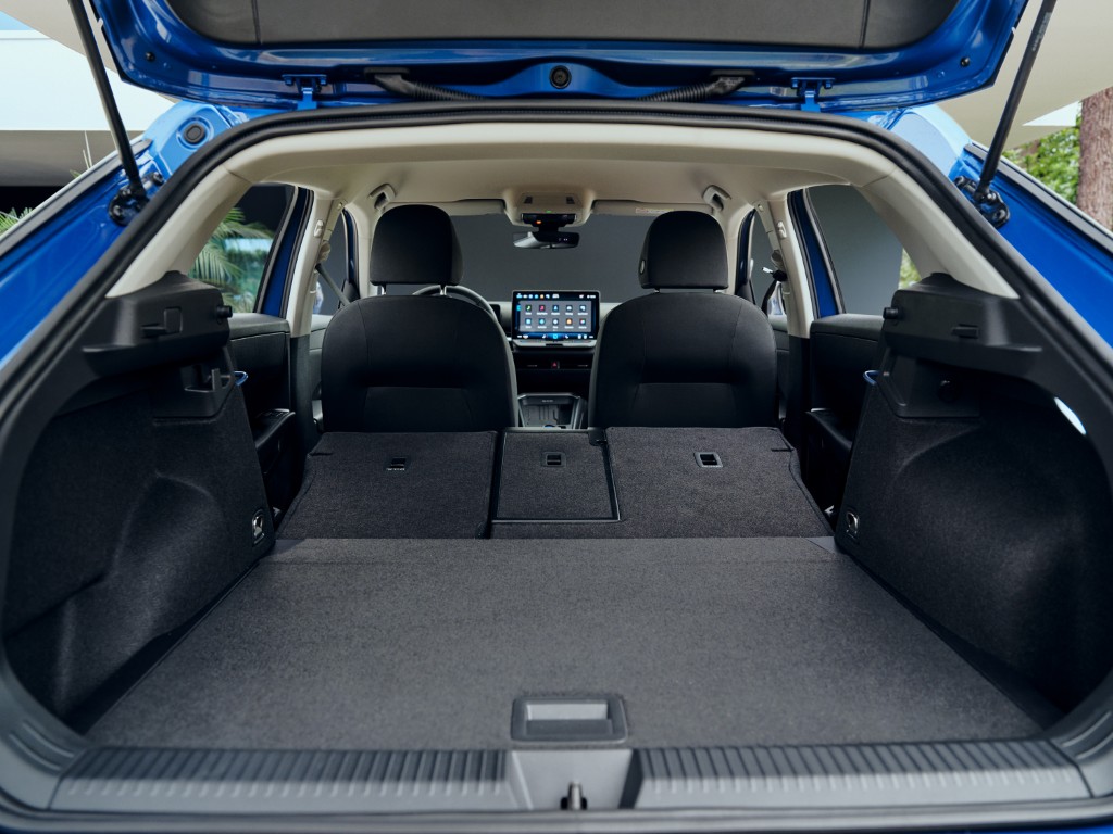 Im Innenraum setzt Volkswagen auf klare Linien und horizontale Gliederung. Hochwertige Materialien wie stoffbespannte Oberflächen, perforierte Kunstlederdekore und neue Sitzstoffe heben die Wertigkeit deutlich an. Die Bedienung ist intuitiv: griffige Multifunktionstasten, ergonomische Türöffner und ein Fahrerlebnisschalter für verschiedene Funktionen. Neu ist das Windshield-Head-up-Display. Das Kofferraumvolumen wächst auf 475 Liter, die Rücksitzlehnen sind im Verhältnis 1/3 zu 2/3 klappbar. Ab „Life“ lässt sich die Mittelarmlehne separat umklappen, um lange Gegenstände zu transportieren.